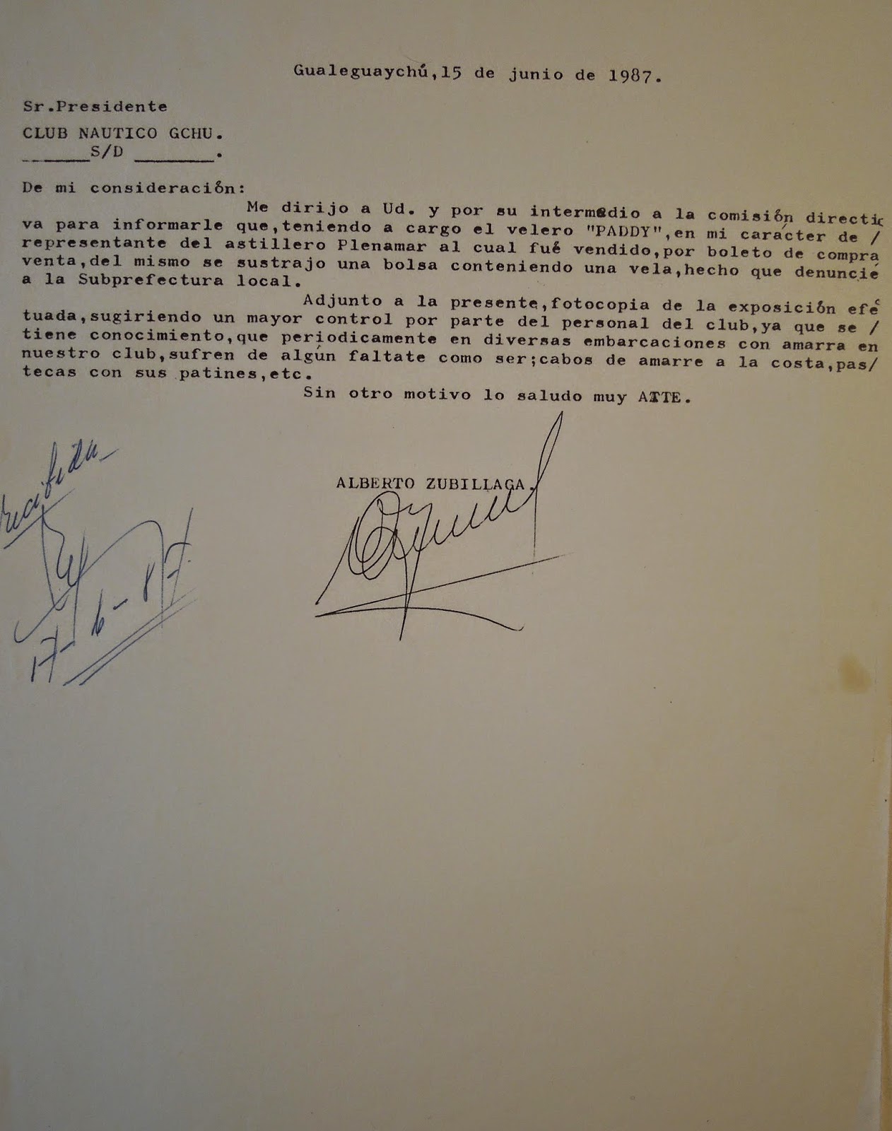 Boleto de compraventa del CICLOTIMICO y PADDY por Gallego Zubillaga y denuncia de robo del foque del PADDY